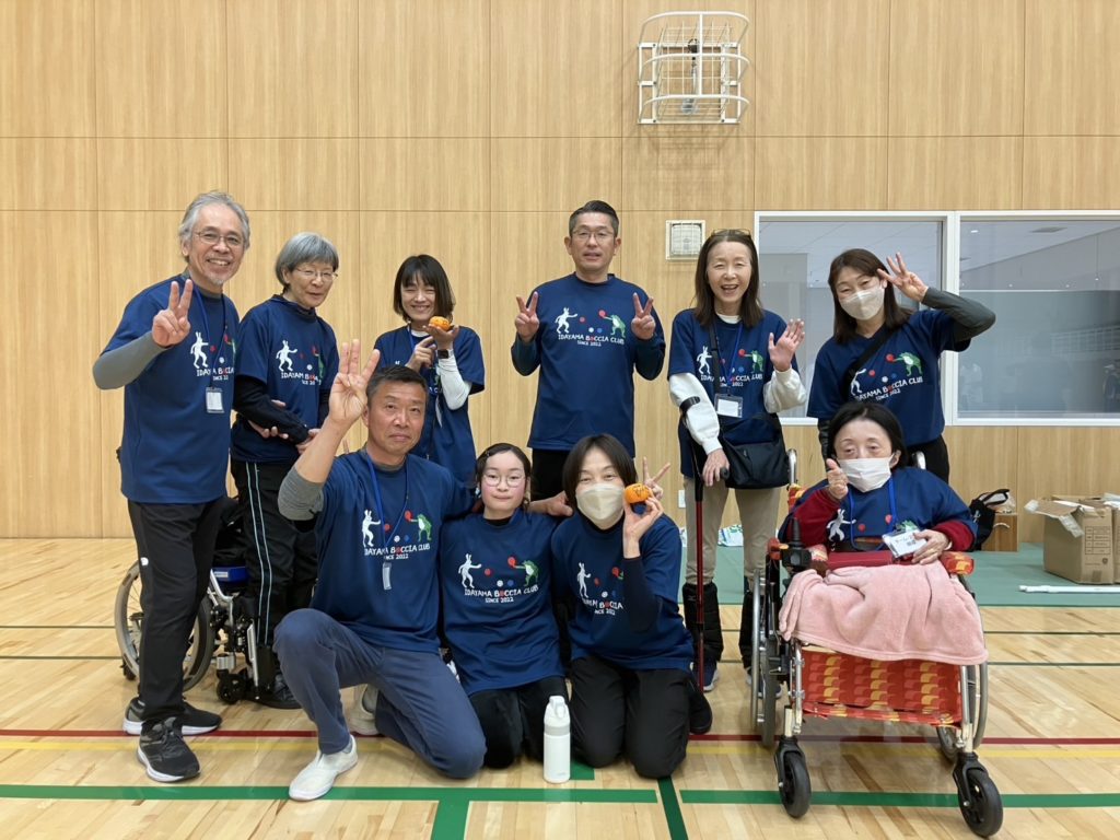 去年、井田山ボッチャクラブのTシャツを作り、みんなで着るようになりました。練習場所の井田体育館の職員さんがデザインしたものです。