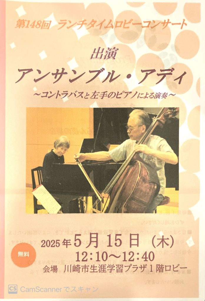 5/15(土)ランチタイム・ロビーコンサート。コントラバスが出演するのは今回が初めてだそうです。